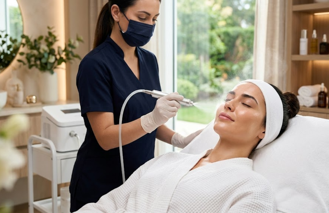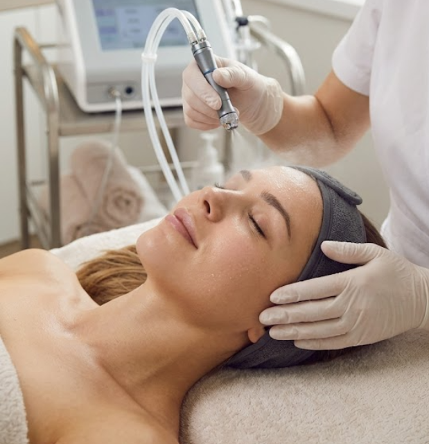 A non-invasive treatment that uses pressurized air and liquid to cleanse, exfoliate, and deliver nutrients into the skin.